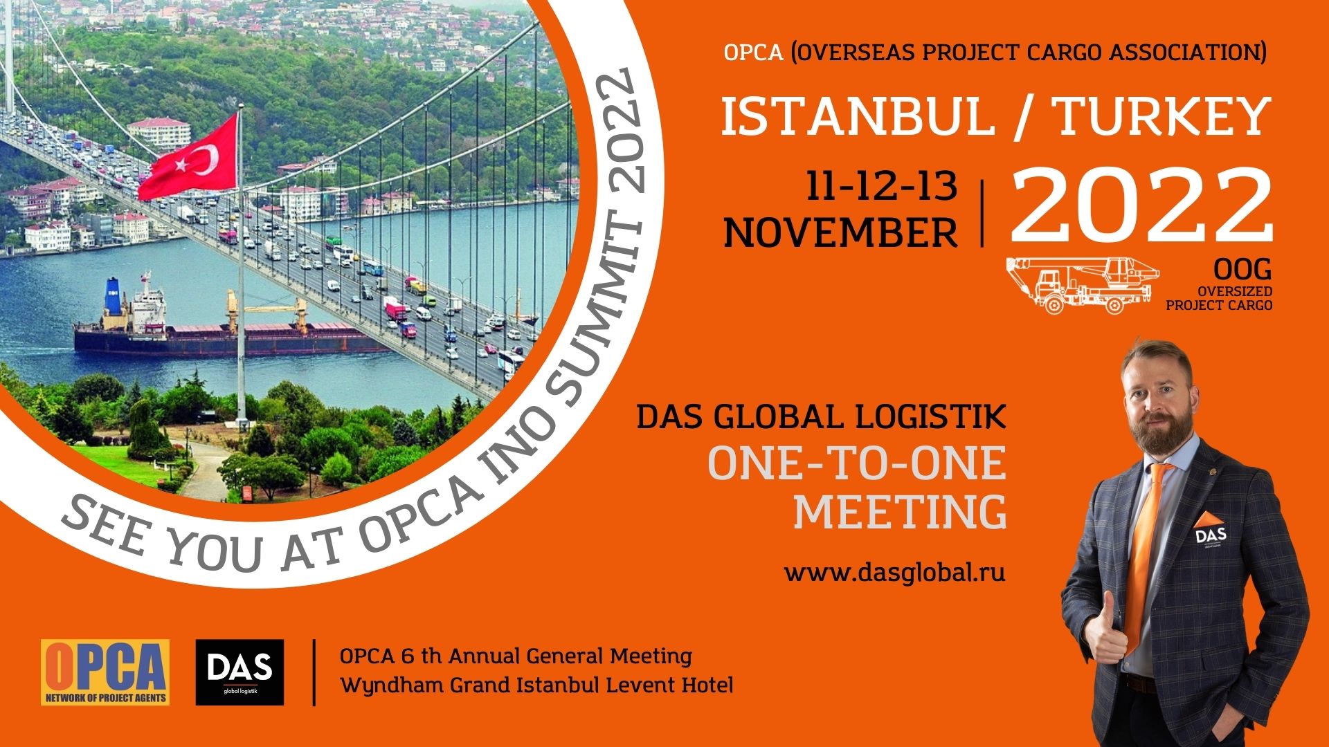За последние несколько лет, и в особенности за текущий год логистика претерпела ряд важных изменений и нововведений и конечно же, для продолжения успешной работы на рынке крайне важно постоянно расширять круг деловых партнеров и спектр оказываемого сервиса. Участие в международных конференциях и форумах предоставляет отличную возможность для установления взаимовыгодных бизнес-связей и стратегического развития компании. Компания ДАС ГЛОБАЛ ЛОДЖИСТИК регулярно принимает участие в профессиональных международных и российских масштабных мероприятиях, и мы рады вам сообщить, что в рамках расширения сотрудничества с бизнес-партнерами со всего мира и освоения новых сегментов рынка с 11 по 13 ноября в рамках саммита INO SUMMIT пройдет конференция OPCA (OVERSEAS PROJECT CARGO ASSOCIATION) – 2022 в городе Стамбул, Турция.